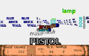 Here’s the latest batch of madness from the TryHard Wolfers. ‘Blazkowicz’s Text Adventure’ eschews formal pixels and instead display every object, wall or enemy as text. Very interesting gameplay. It is possible to toggle between dark mode and light mode. The screenshot below depicts the light mode. DOS only.